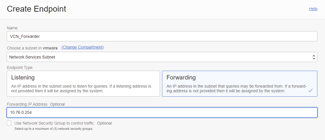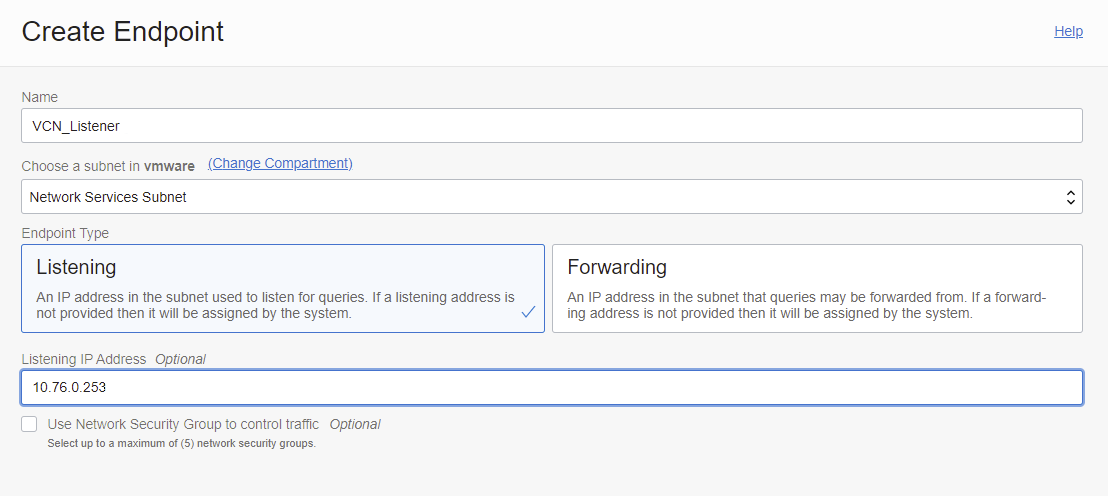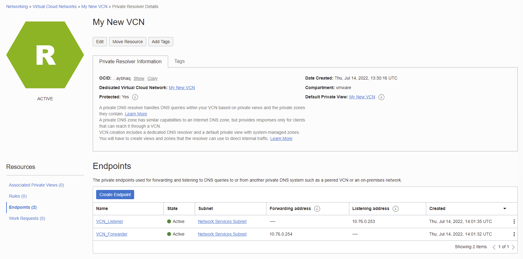 Hidden away in the OCI DNS world (which you can read about in the official docs here) are a couple of tools to help. The problem is two-fold. Firstly, if we want our SDDC devices to be able to resolve hosts in the OCI VCN we need a way to forward queries to the OCI DNS “server”. Secondly, and, conversely, if we want devices in native Oracle Cloud using their OCI provided DNS to be able resolve hosts in the SDDC AD/DNS world, we need a way to forward queries to our DC/DNS servers. While the native DNS service is somewhat obscured behind the scenes, OCI has a way to push it through the curtain and into the spotlight in the form of DNS “Endpoints” which the Console describes as;