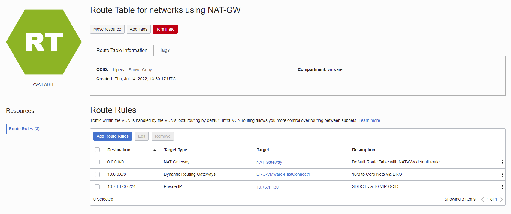 From the bottom upwards, the rules in this simple example route traffic back to the SDDC via a Private IP route target, our On-Prem networks via a DRG route target, and everything else to the Internet via a NAT-Gateway target.