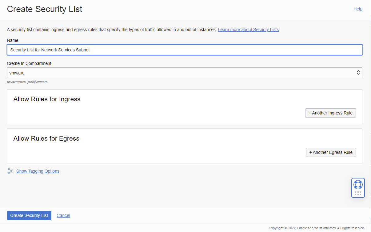 While sharing a Route Table might make sense, we should probably have a dedicated Security List for our Network Services. Visiting the Security List page in our VCN and selecting the blue “Create Security List” button presents us with this: