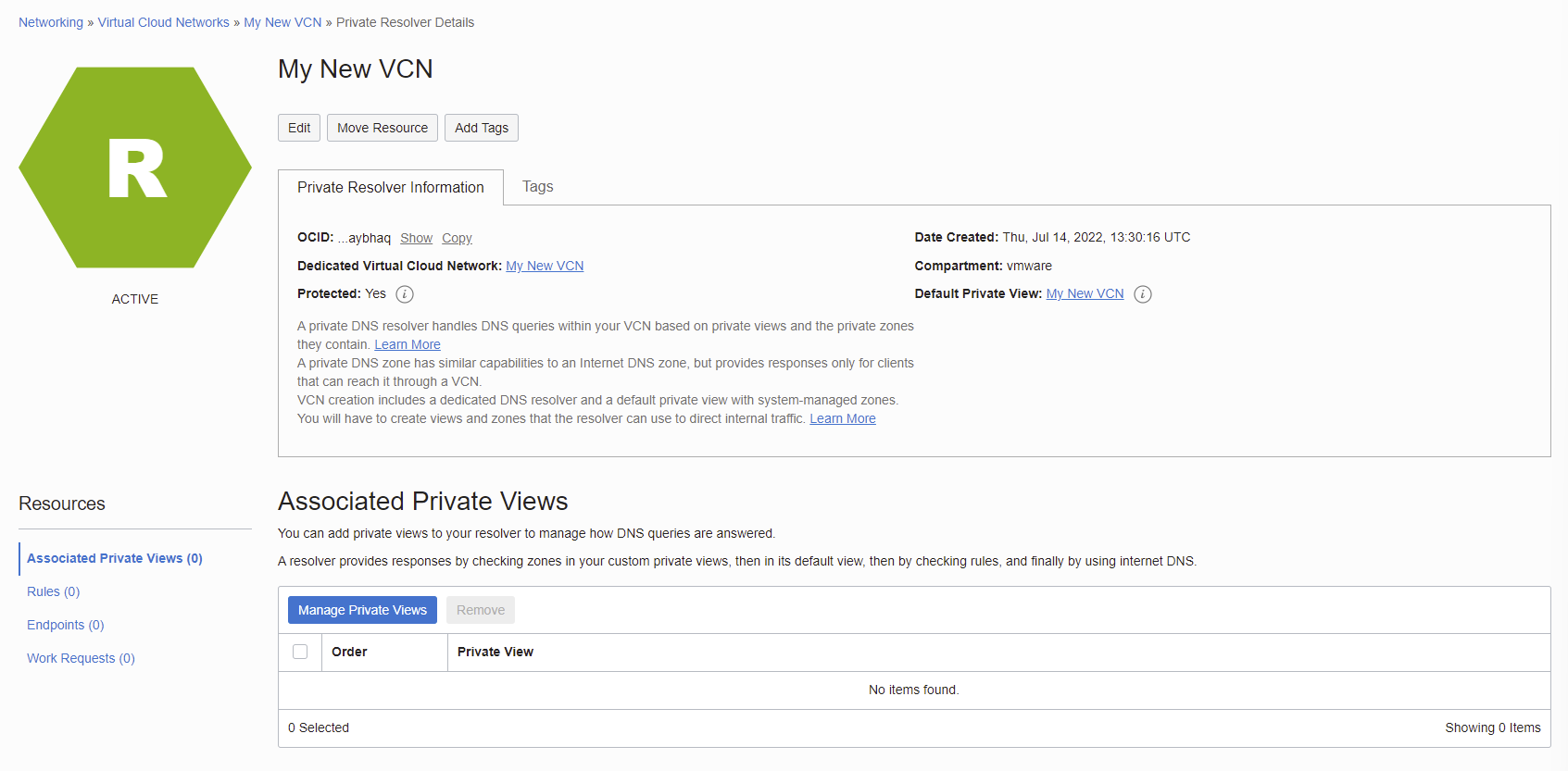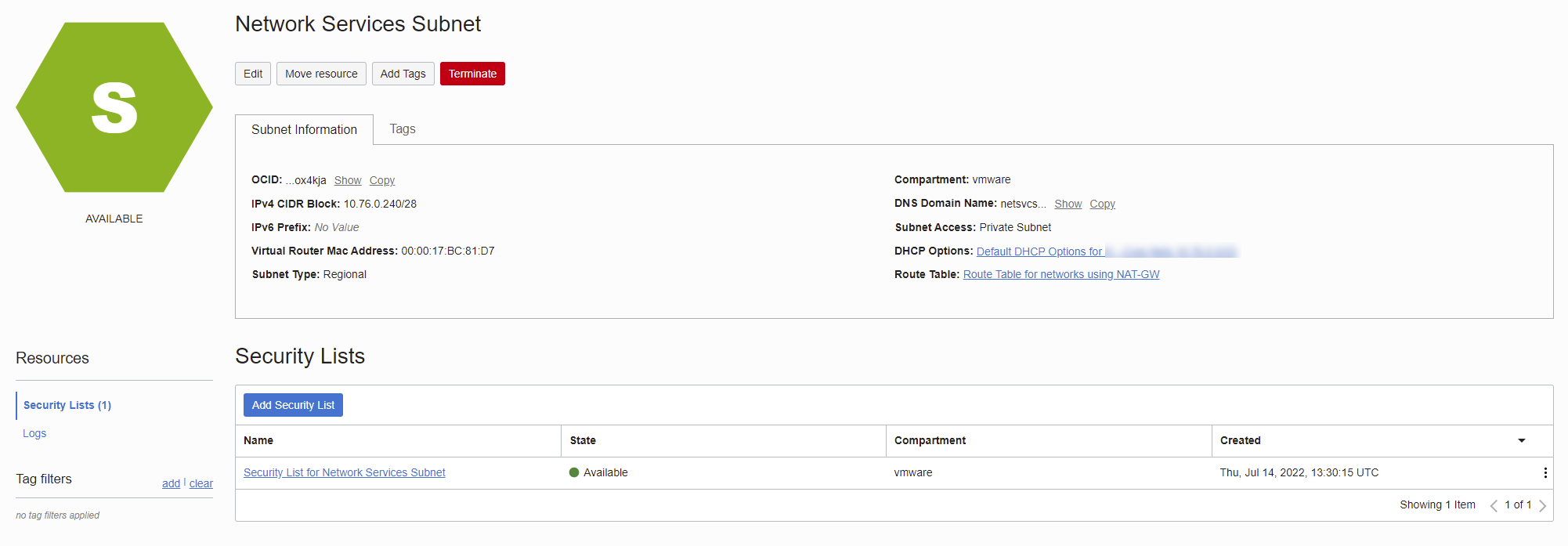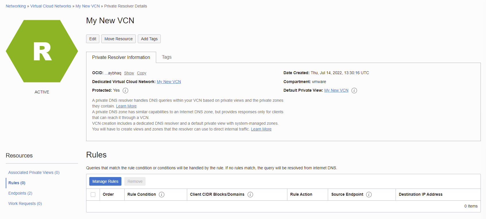 We don’t need to do anything much here in the OCI console to receive queries for the VCN Resolver. The IP address we selected for the Listening Endpoint will be the target used in the forwarding rules on our SDDC or on-prem DNS servers, and the Security List rules, together with any other filtering rules in the NSX firewalls in the SDDC, or between the Listener and a remote, on-prem, DNS Server will play their part of course.