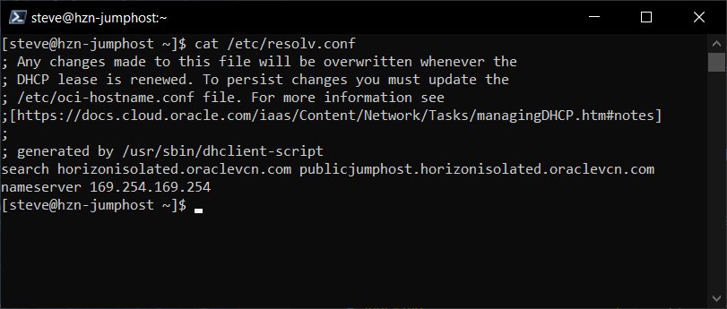 If we take a quick look at a Linux VM in OCI, and check its DNS server (which in Linux is usually found in the /etc/resolv.conf file), we see this.