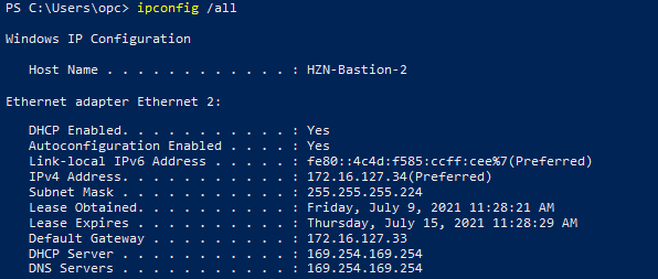 Asking the VM to list its resolv.conf file, we see some notes about how/where the actual address is set from, and then, finally the IP address of the VM’s DNS server. In this example it is 169.254.169.254. If we check out the DNS server which a Windows VM in OCI picked up from DHCP, we see this.