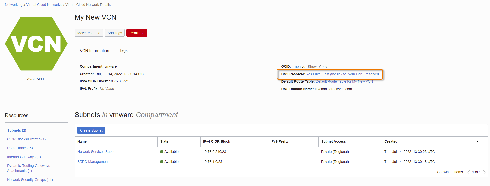The main downside of this for our SDDC workloads is that inside the NSX overlay, they don’t live on OCI networks and so can’t reach either version of the magical OCI DNS resolver. But, all is not lost.