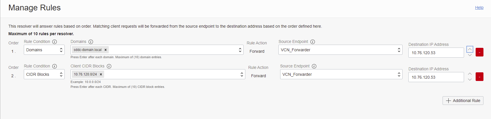 sddc-domain.localand reverse lookups for hosts in10.76.120.0/24to our remote resolver. - Action - At the moment, we can only specify Forwarding rules here so this field doesn’t help much.