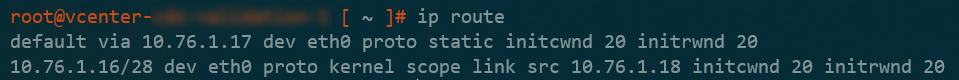 As you can see, this vCenter is using 10.76.1.17 (and its own localhost loopback address) as its DNS server (not the 169.254.169.254 address we saw earlier). If we take a look at its routing table using the shell’s ip route command…