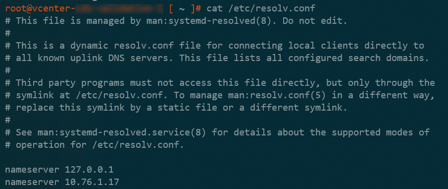 While the APIPA trick works, it isn’t really within the spirit of “link-local”, so newer OCI subnets and VLANs have DNS forwarders hidden inside their gateway interfaces. Let’s take a look at a vCenter in one of our newer lab environments to see this in practice. Here’s the /etc/resolv.conf entry from the VCSA shell.