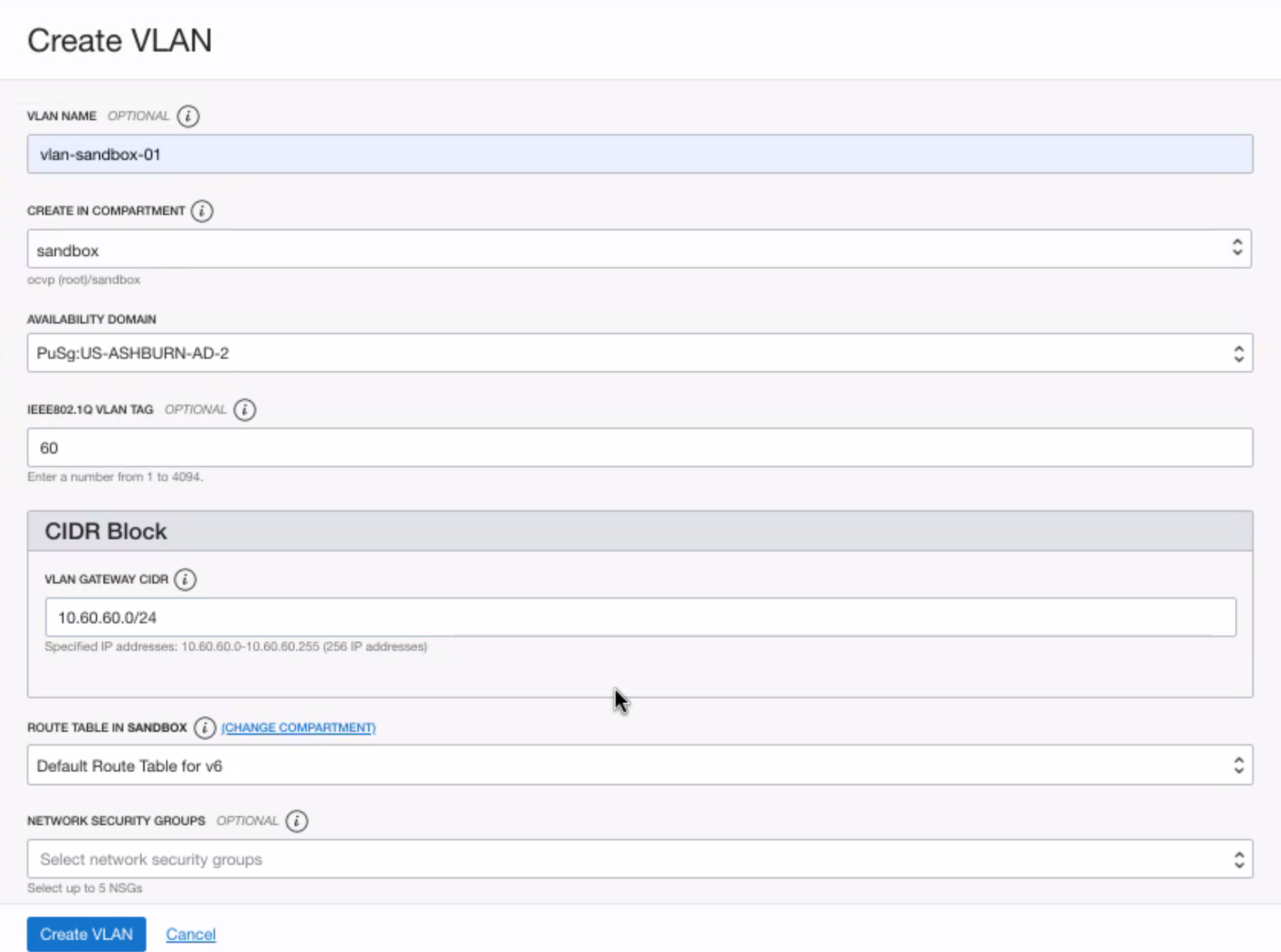 When creating a VLAN remember, it is ( currently) local to a single Availability Domain. So, make sure you create the VLAN in the same AD as your SDDC. It will still create successfully if you do create it in the wrong AD, but you won't find your VLAN in the list, when you go to attach it to your SDDC hosts in the next steps.