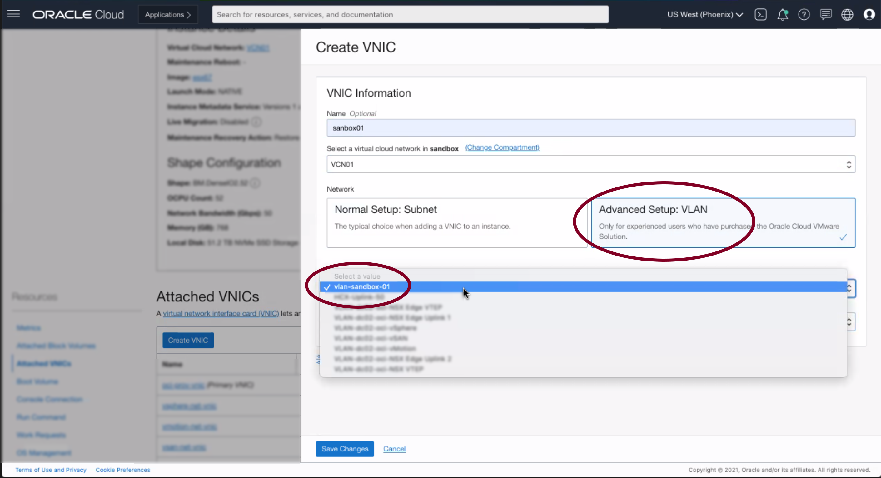 To tell OCI to present the VLAN to a host we “create a VNIC” on the host, and attach that VNIC to the VLAN as you can see here: