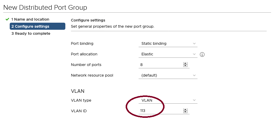 In the image above, we’re creating a new Distributed Port Group and tagging traffic leaving the host with VLAN ID “113”. If we have two VMs in this Port Group on the same host, their traffic won’t leave the host, so, they should be able to communicate with each other. If we move both VMs to another host, as long as they’re both on that host, their traffic won’t leave the new host, and they will also be able to talk to each other.