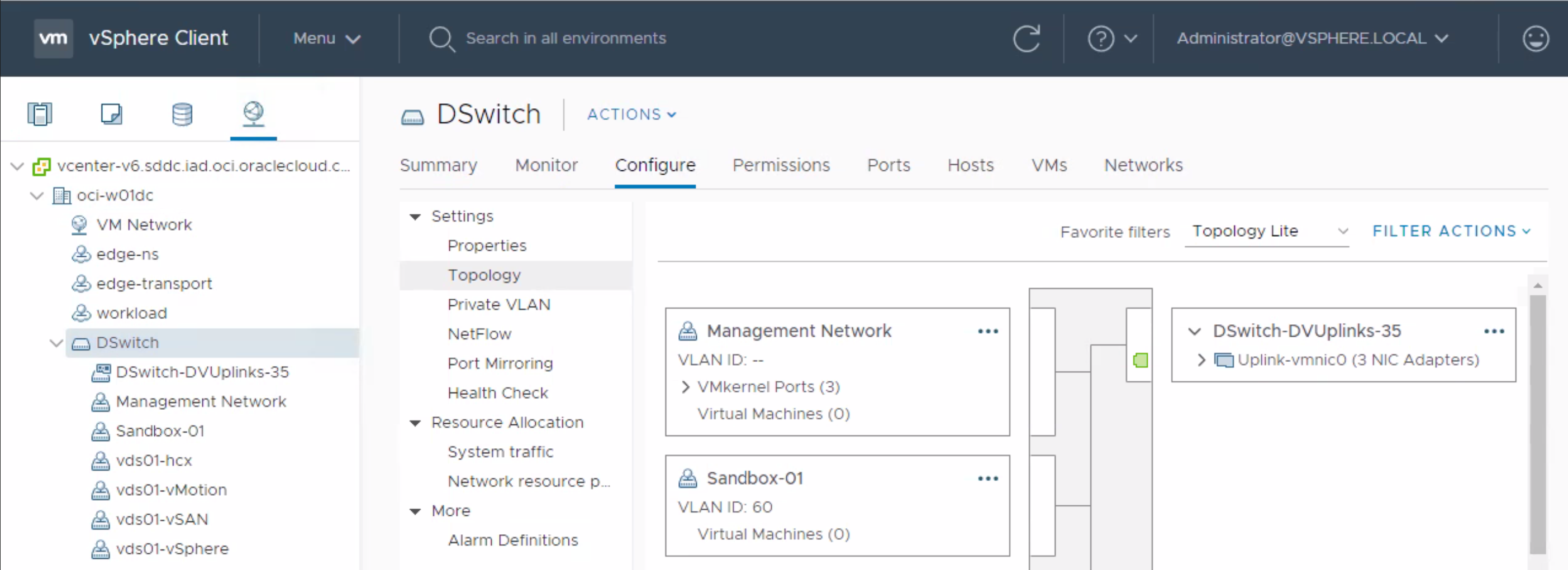 Here you can see our Sandbox-01 Port Group in the list and in the Topology image. As this is a three-node cluster running vSphere 6.7, we’re only attached to one physical NIC per host and we see “(3 NIC Adapters)” in the uplink set for “DSwitch”.