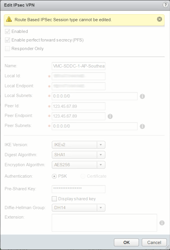 Then, below the line, the encryption parameters for the tunnel, key exchange parameters etc. and the Pre-Shared Key we’ll use. There are other parameters that aren’t editable from the VMC Console. Have a look at the VMC docs if you’d like to know more about those.