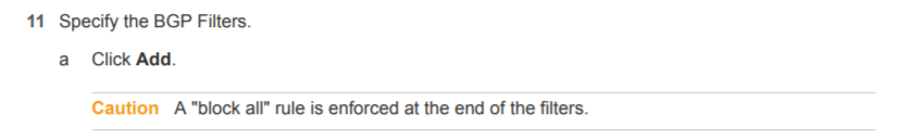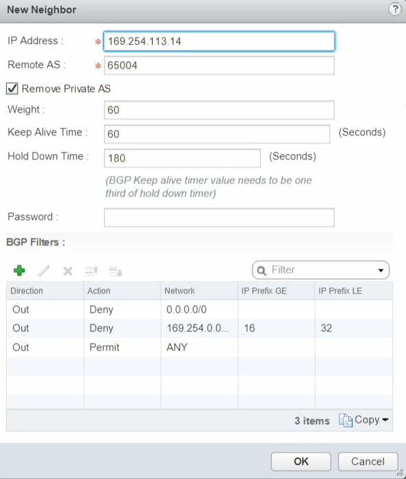 Out Deny 0.0.0.0/0 -This is necessary in our lab, and it’s worth covering here as it may apply in your scenario too. There’s a setting on the BGP Configuration screen labelled “Default Originate”. When turned on, the Edge will, if it has a Default Gateway set, advertise itself into BGP as the default route to everywhere else not specifically detailed in the distributed routing updates. When turned off, it err… appears to do exactly the same. Anybody reading this who knows how to fix that, please shout! In this environment we do need the default route setting. This ensures our Edge sends Internet traffic to the next hop router in our lab, which we don’t control, and so can’t use BGP (or OSPF for that matter) to dynamically learn routes from. We don’t want all the other sites to send their Internet traffic through us, so we deny sending that route with this filter.