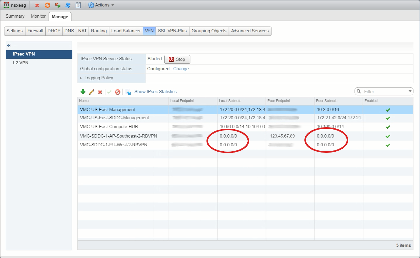 Moving to the NSX-V end things get a little more complex. When the NSX-V GUI was originally designed, the only Layer 3 VPNs we needed to configure where Policy-Based. The GUI is nicely layed out to show all the key details of those. Here is a view of the Policy VPNs we have configured.