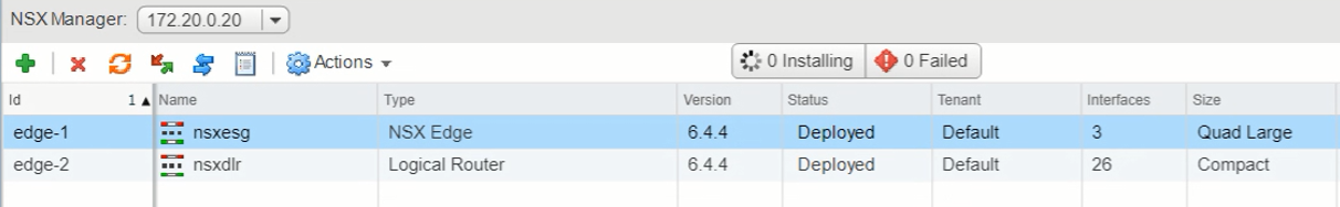 Onto the actually useful stuff… To start with we’ll need to GET the current VPN “ipsec/config” with that first API call we saw earlier, and for that we’ll need the {edgeID} to put into the call. We could use the API to get a list of Edges, but as we have access to the NSX Manager, let’s use the GUI. Here’s the list of Edges we have deployed and there are only two. “edge-2” is the Distributed Logical Router, and “edge-1” is our Edge Services Gateway.