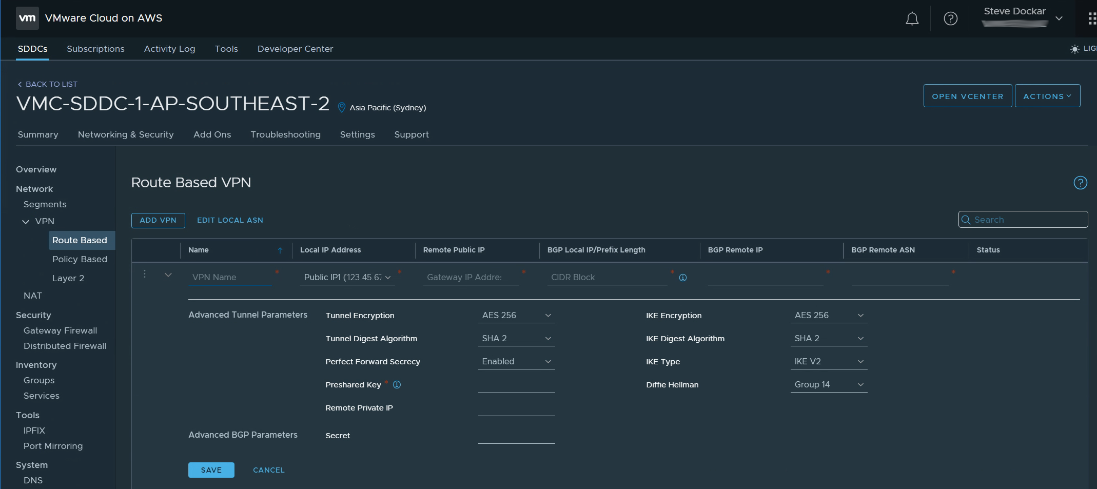 In NSX-T terms, that VPN Public IP is on the T0 router, and the Management and Compute Gateways are on T1 routers. Of course VMC hides that away so you don’t need to worry. Moving on, below, you can see the Route-Based VPN configuration screen.