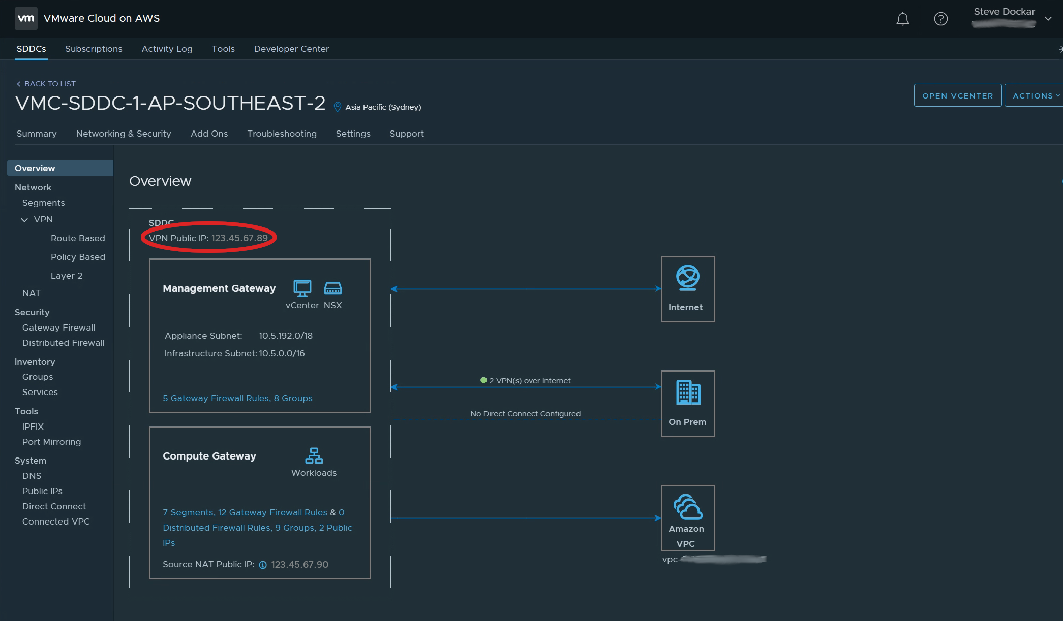 Here is the overview of our target SDDC. You can click the images for the full-sized versions. Its “VPN Public IP” is highlighted in the red oval, we’ll need this later on.