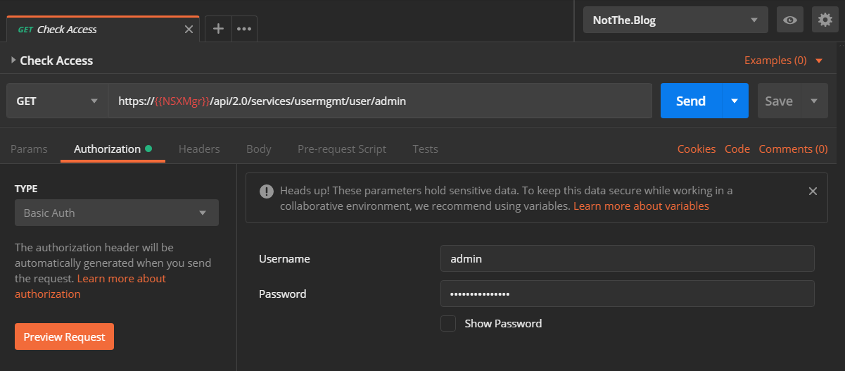 GET https://{{NSXMgr}}/api/2.0/services/usermgmt/user/adminThe {{NSXMgr}} text is a Postman variable. This allows us to use this and the other API calls in the collection on different NSX deployments by swapping the variables’ contents stored in Postman’s “environments”. In this case {{NSXMgr}} holds the IP Address/FQDN of our test NSX Manager. We’ll also need to authenticate the request so we use the Authorization tab, select “Basic Auth” in the TYPE field and add our Username/Password so the request looks like this.