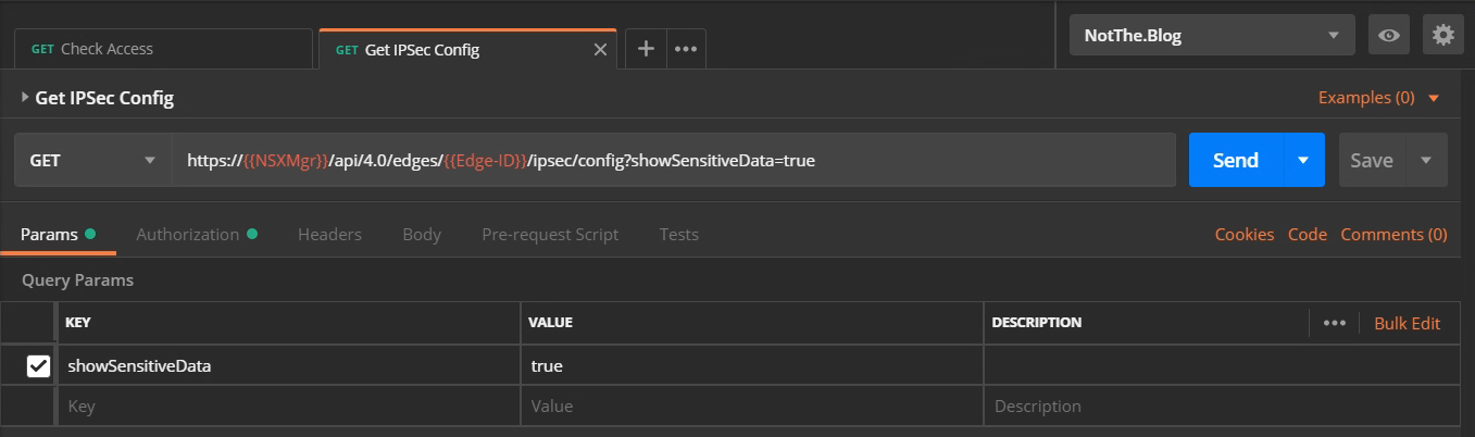 GET https://{{NSXMgr}}/api/4.0/edges/{{Edge-ID}}/ipsec/configAdding an entry to the Params section with a KEY of “showSensitiveData” and a VALUE of “true” will get the call to return, well, sensitive data… like err.. Pre Shared Keys, which is useful if you want to see what is configured, but should obviously be used wisely. Here’s that call in Postman with the optional Param added.