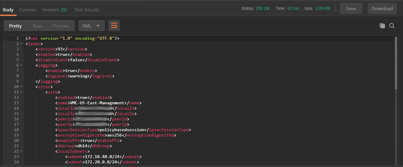 </ipsec>Now here’s the complete body of the response we got back. I’ve highlighted the details for one of our existing Route-Based VPN sites (lines 36-65), and we’ll use that as a template for the new site in a moment. If you don’t have a Route-Based VPN site you can copy yet, feel free to start with this one, or grab the template from the example response shown in the official NSX API docs page on VMware code.