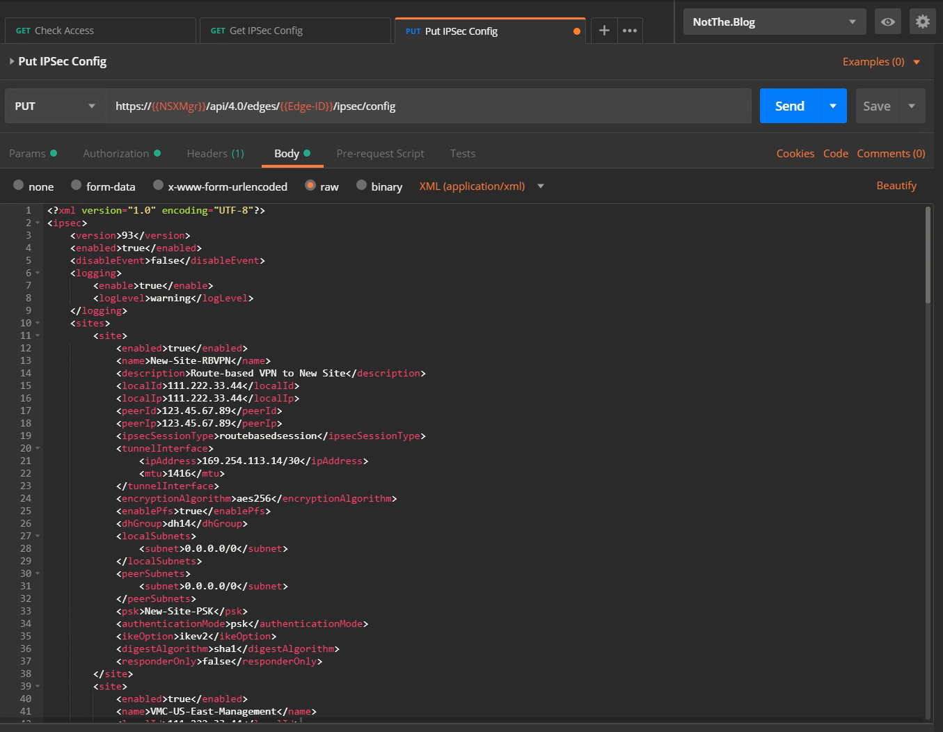 </error>Here we can see that if you include a <siteId> NSX presumes you’re changing that existing site, which we’re not, and so “ipsecsite-31 could not be found” makes sense. The solution? Once again, remove the field from the body and let NSX assign that value. Done!