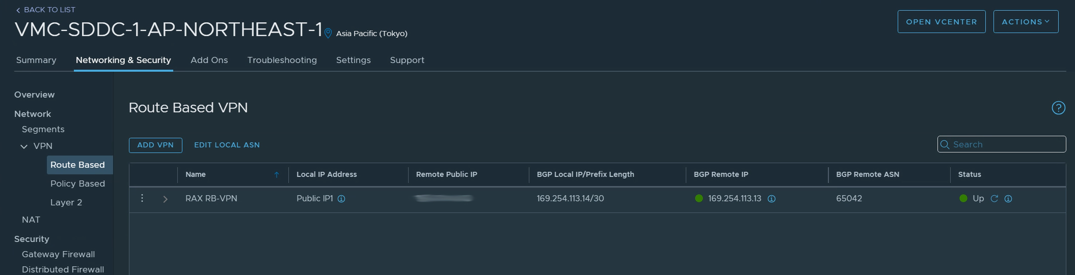 We can see how things look from the VMC end quite easily, and checking the VPN’s “BGP Remote IP” and “Status” fields show two nice green indicators.