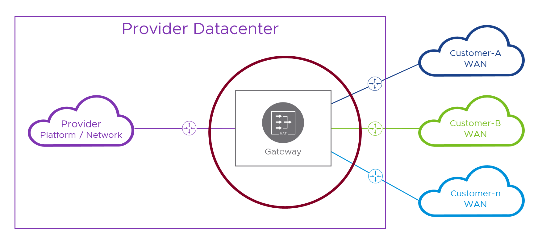 Let’s just recap a couple of the points from that last paragraph in pictures, as it will set us up nicely to design a working solution. First, in the picture below, we’re using a single routing device / Gateway to both NAT packets and interconnect the various networks. This would be convenient for a Provider as they could manage all this complex networking malarkey in one place, except we learned in the last post that this won’t work. The reason was that, although NAT swaps from (potentially overlapping) customer networks to something coordinated by the Provider, on the way back, when we (un)NAT back to real addresses, that single routing device needs to send the packets back to the correct customer network which it can’t do when faced with multiple ‘10.1.1.1s’ in different customer networks! The red circle is the gateway’s view into all the connected networks and their potentially overlapping address ranges.