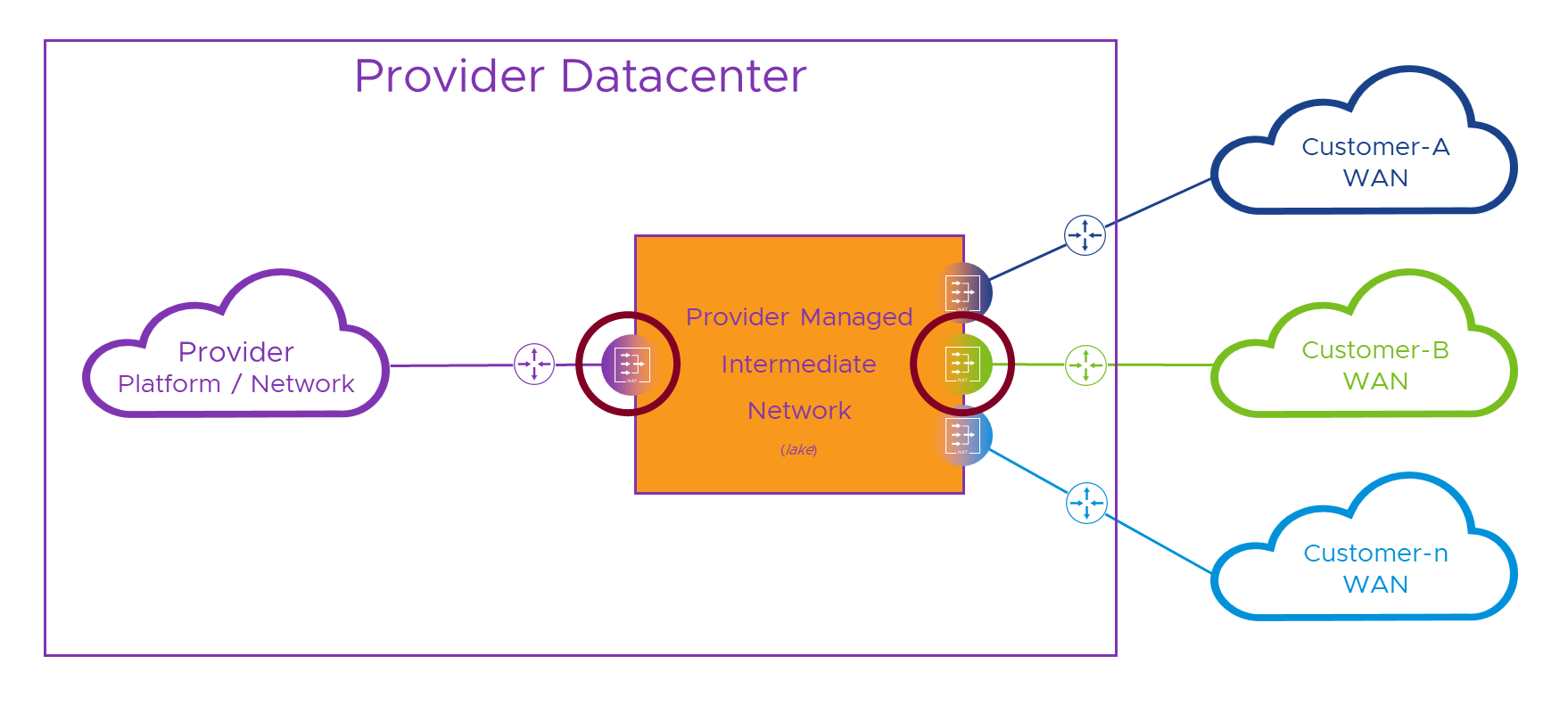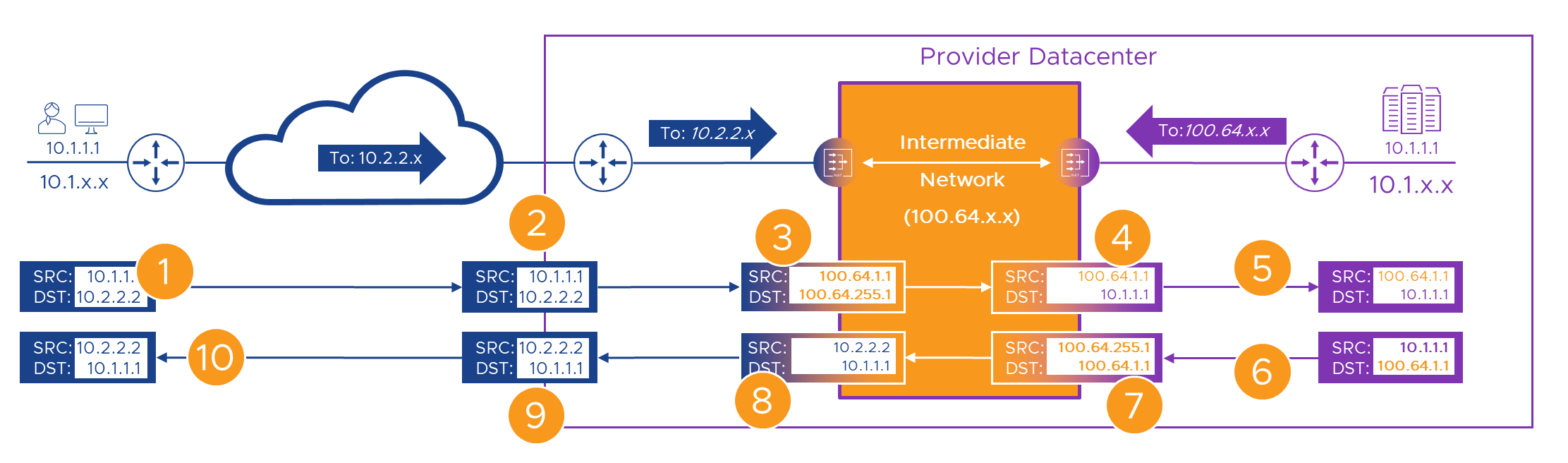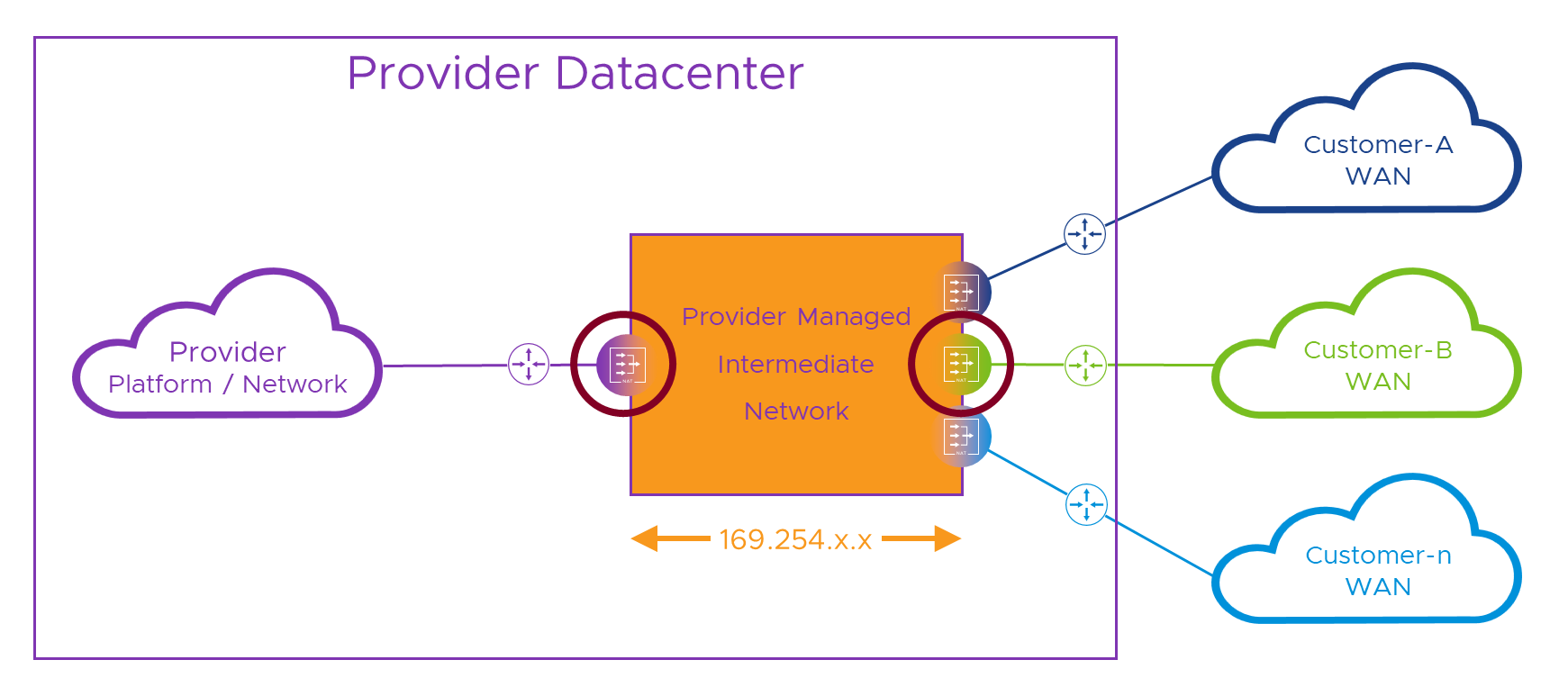- In the Provider network, we route these new ‘10.255.x.x’ addresses back to our intermediate network NAT device.