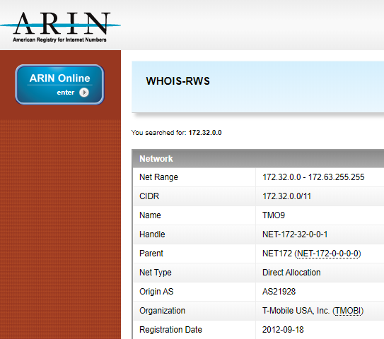 There are three subnets reserved in our old friend rfc1918. There’s ‘192.168.0.0/16’ (or ‘192.168.x.x’) which we often find in consumer level networking devices. Then there’s the more industrial strength ‘10.0.0.0/8’ (or ‘10.x.x.x’) which we often see in enterprise and Service Provider networks. The third subnet it slightly different and not so easy to simply drop ‘x’ into. It’s ‘172.16.0.0/12’. As the slash-twelve doesn’t fall nicely on an octet boundary like slash-eight and slash-sixteen, this range is ‘172.16.x.x’, ‘172.17.x.x’ all the way up to ‘172.31.x.x’. The subnets from ‘172.32.x.x’ upwards aren’t included in the reserved range so shouldn’t be used in private networks. According to the ARIN search below, ‘172.32(.x.x)-172.63’ belongs to T-Mobile US, and if we bothered to search further, we’d find out who the rest of the range belongs to.