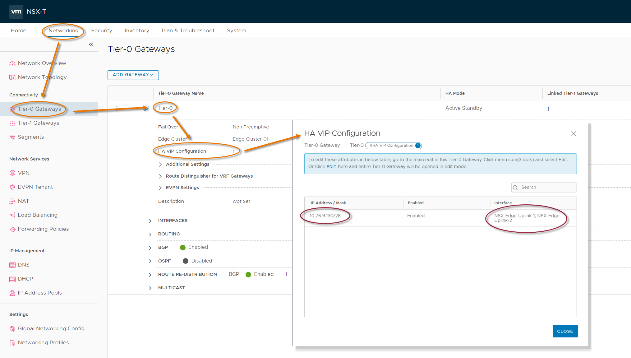 - Work out the IP address assigned to the NSX Tier-0 HA VIP.