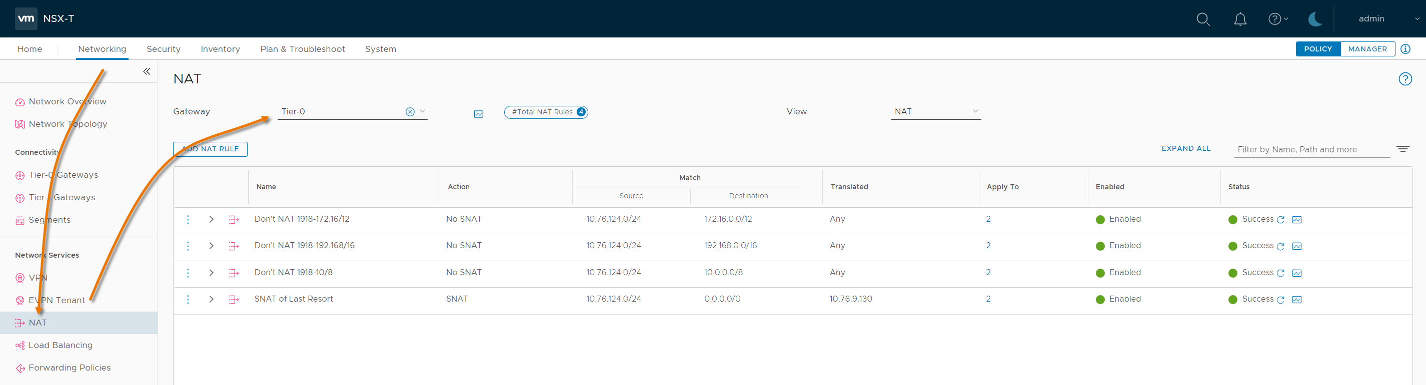 We know from the OCI example that the NAT Gateway takes care of that NAT for us, but we have to do some configuration work inside NSX-T to enable the Source NAT there. Let’s take a look at that config in the NSX Manager GUI. Here it is, in the Policy UI: