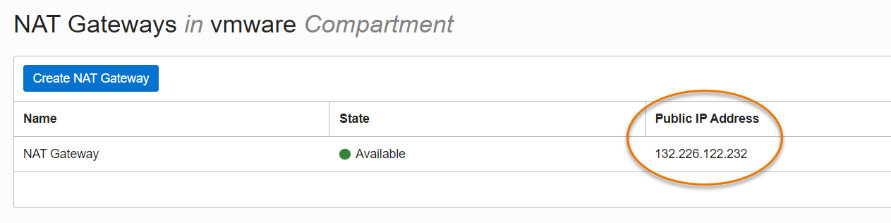 Here’s a list of NAT Gateways in one of our test OCVS tenancies, again showing the helpfully confusingly named, “NAT Gateway”. As you can see from the conveniently highlighted area, the NAT Gateway has its own Public IP Address, in this case 132.226.122.232.