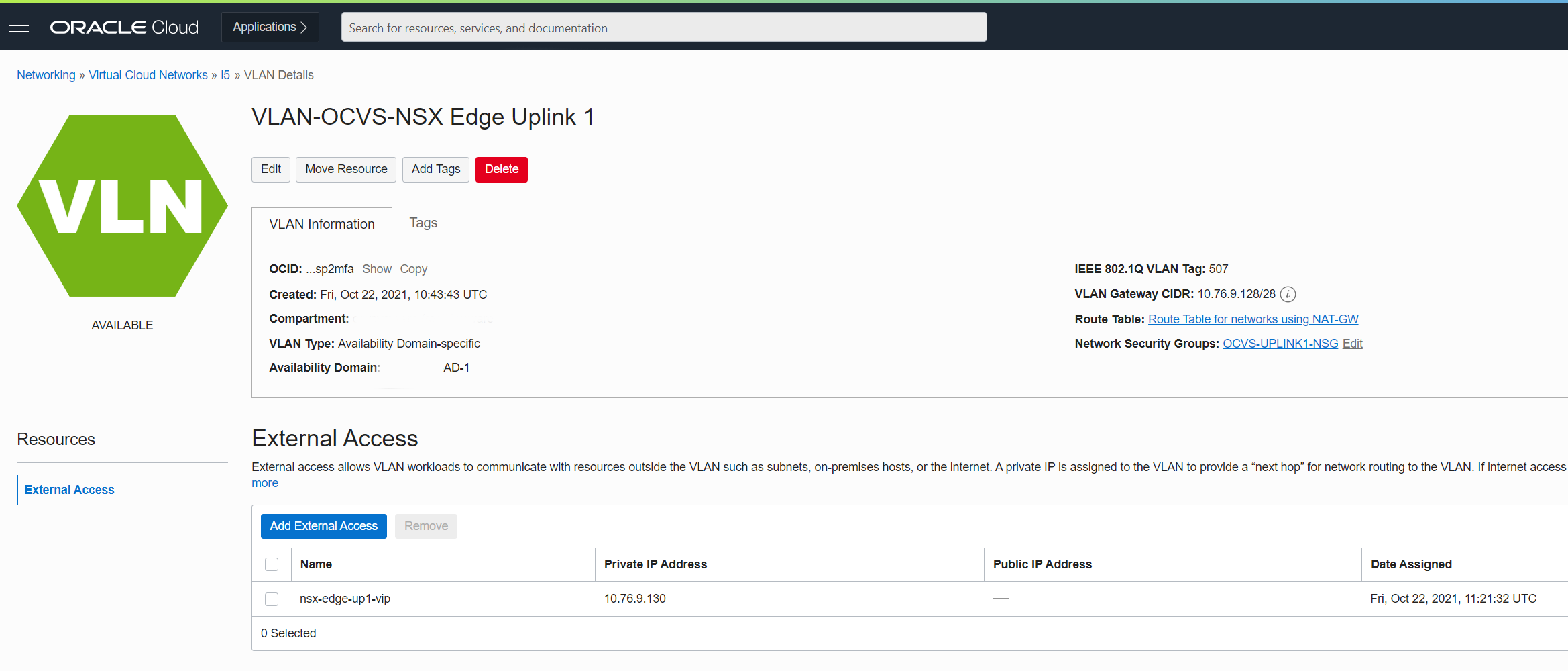 OCI VLANs are Layer 2 constructs, so, from a Layer 3 IP addressing perspective, OCI doesn’t really need to care what goes on in there (a bit like the rest of the world and Las Vegas), except when it needs to send something into the VLAN (again, like Vegas…). To allow OCI to keep track of a Layer 3 IP address inside the VLAN, we assign an External Access (V)IP. This anchors the IP address of some interface of a device inside the VLAN to an OCID. The rest of OCI can then use the OCID to find that device interface even in an opaque Layer 2 VLAN. Here’s the “VLAN Details” view of the Uplink-1 VLAN: