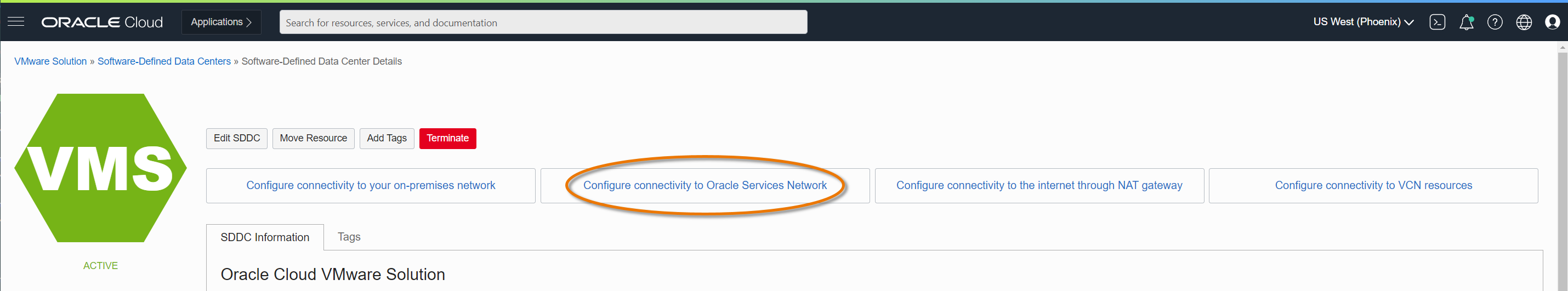 If we use any OCI native services, we can take advantage of the Wizard in the SDDC Details page (below) to set up the Service Gateway.