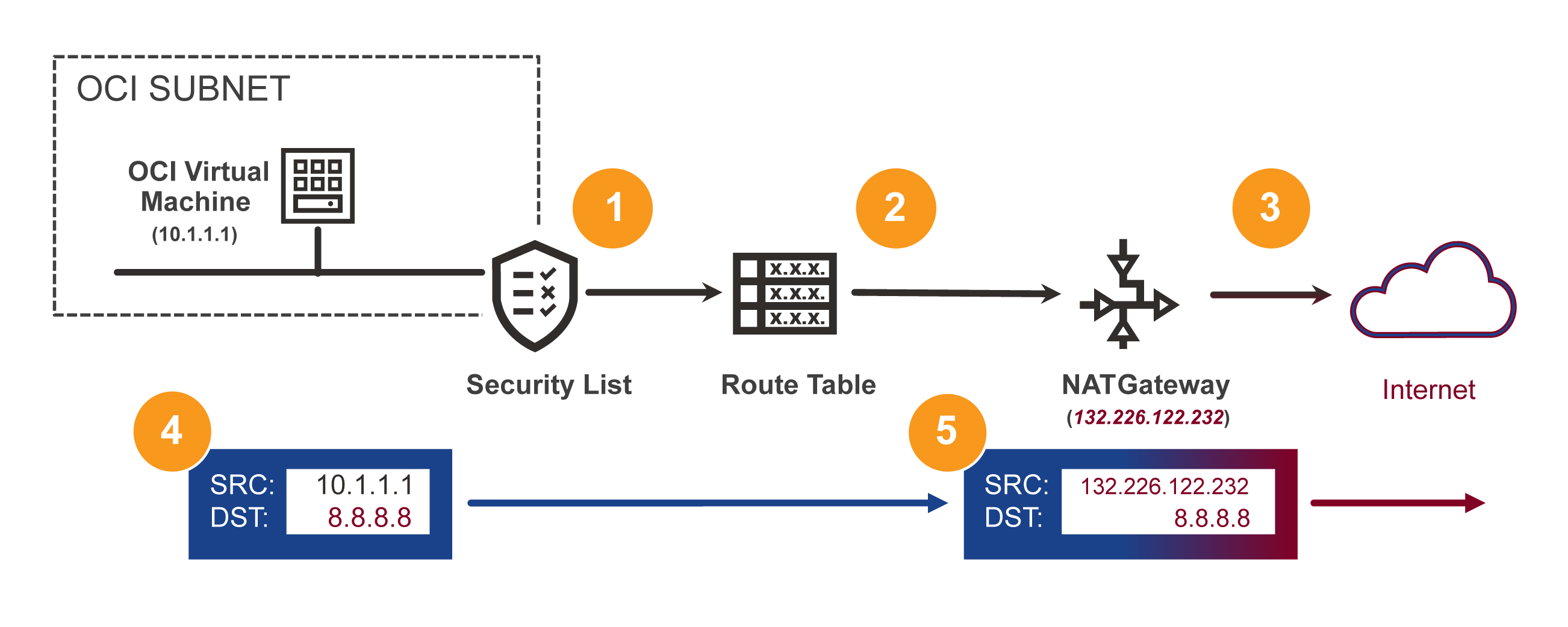 In (4) we can see the packet has the VM’s private source address of 10.1.1.1 and the destination public address of 8.8.8.8. As packets pass through the NAT Gateway in (5), it swaps the Source Address (using Source NAT, or SNAT of course) in the packets to that of its own Public IP address, 132.226.122.232. The NAT Gateway keeps track of which private source addresses are talking to which public addresses so that it can reverse this process on packets returning from the Internet.