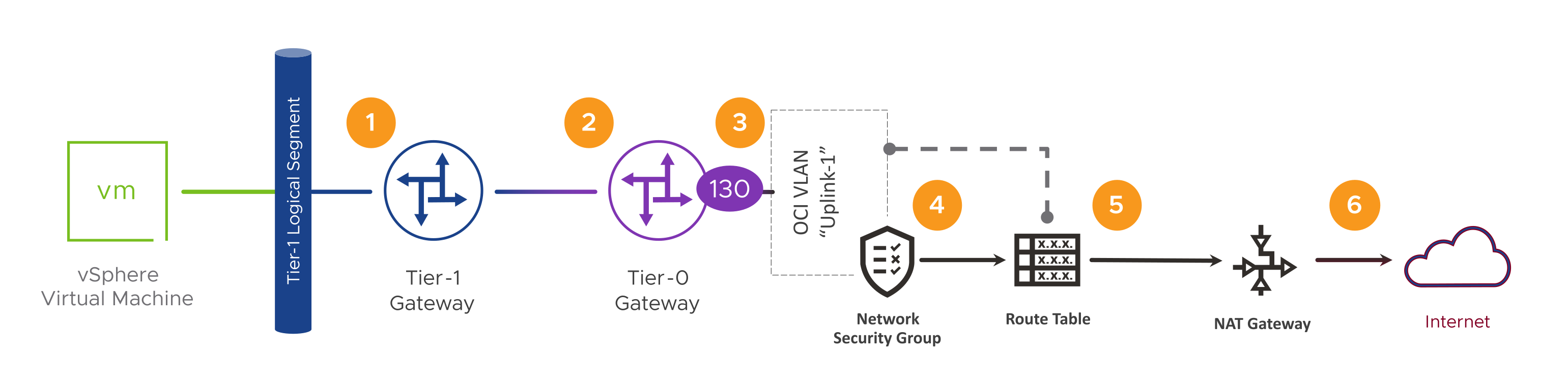 Let’s start off by revisiting the flow diagram, but this time, we’ll add in the SDDC components. We’ll have a workload VM on an NSX-T Logical Segment which is connected to a Tier-1 Gateway. The Tier-1 Gateway is automatically uplinked to a Tier-0 Gateway, which is connected to OCI’s networking layer through a VLAN. From there, things start to resemble the native flow diagram from earlier in the post. In picture form, it looks like this.