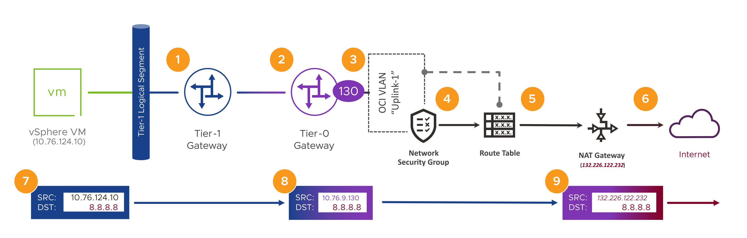 In (7) we can see the packet has the vSphere VM’s private source address of 10.76.124.10 and the destination public address of 8.8.8.8. As the packet passes through the Tier-0 Gateway in it we see the Tier-0 swaps the original source address to its own 10.76.9.130. As packets then pass through the OCI NAT Gateway in (9), it swaps the Source Address (from the dot-130 address of the Tier-0), to that of its own Public IP address, 132.226.122.232. The Tier-0 and OCI NAT Gateways both keep track of which private source addresses are talking to which public addresses, so that they can reverse this process on returning packets.